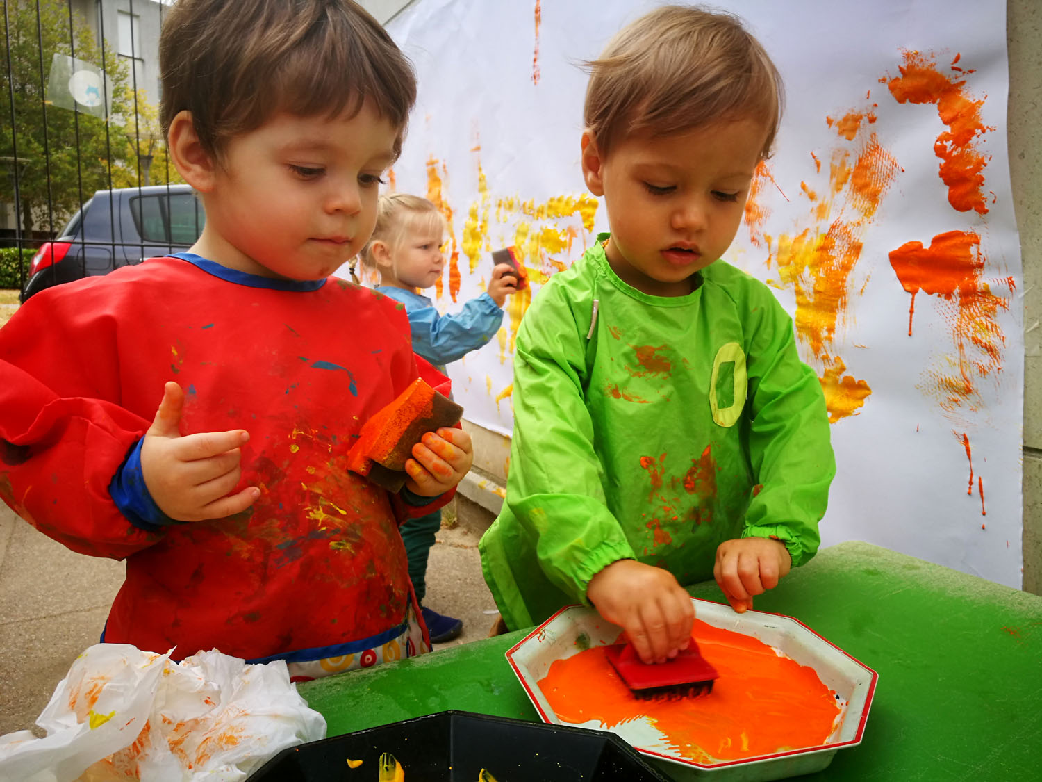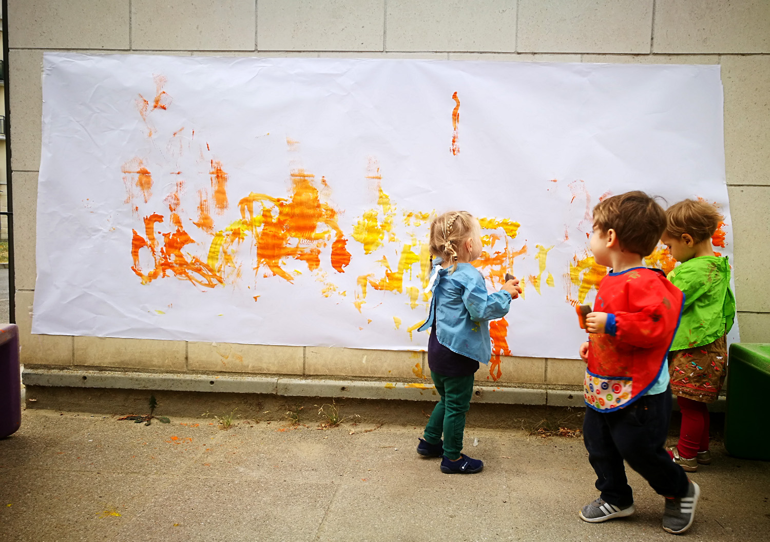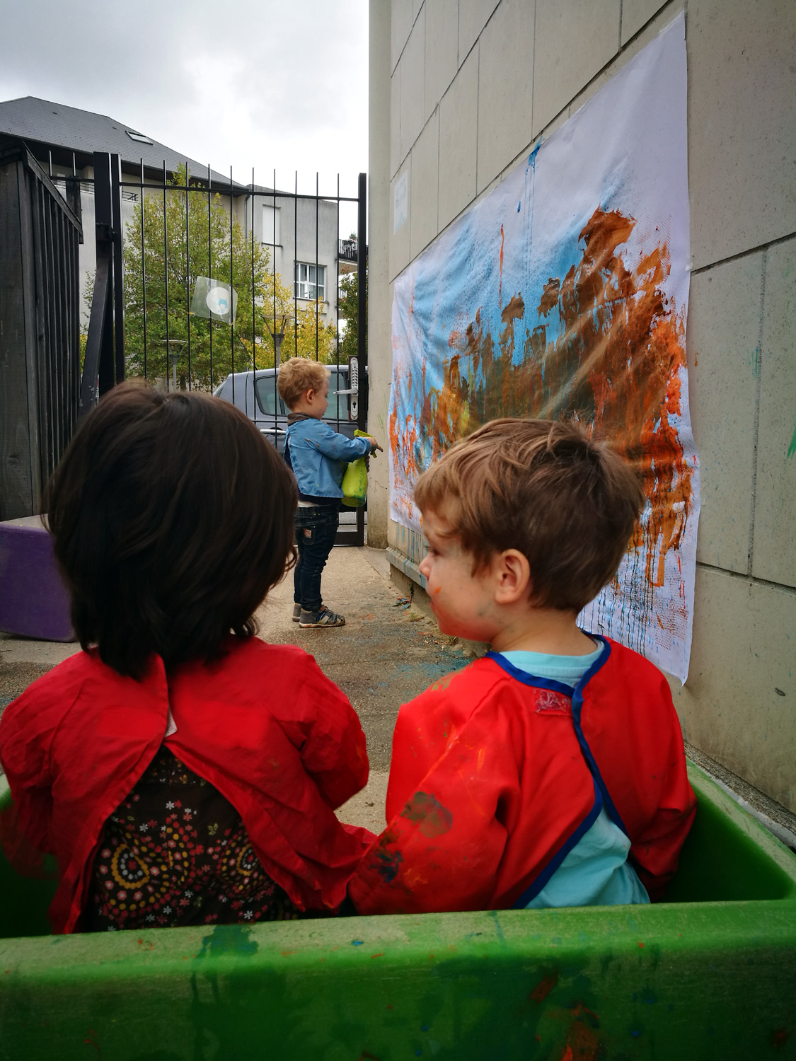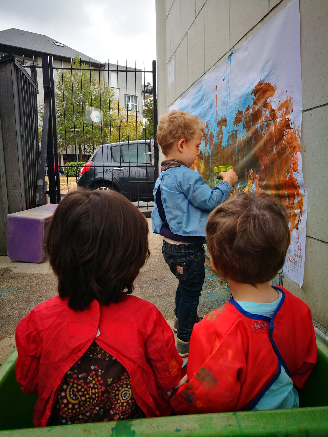 Au P’tit Mouflet, les parents de permanence aiment proposer aux enfants des temps d’expérimentation (culinaire, plastique, physique…). En fin d’été, Xavier proposait de profiter du beau temps persistant pour une activité d’expression plastique « en grand », sur les grandes surfaces murales de la crèche. Faire cela en extérieur, c’est s’offrir la possibilité de déborder du papier sans peur de déborder, c’est permettre aux enfants des aller-retours entre les activités motrices (courir, joueur dans le jardin) et un atelier créatif très libre. Ce jour là, un outil était testé pour la première fois : un pulvérisateur de liquide de nettoyage reconverti en pulvérisateur de peinture (en bleu). Chouette !